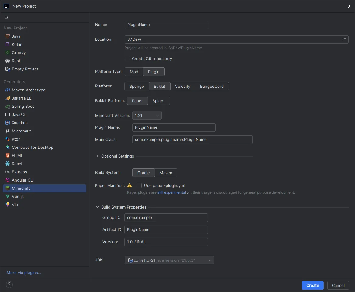 | Paper Manifest | Whether you want to use the new Paper plugins or not. For now this is not recommended as it is still in development. |