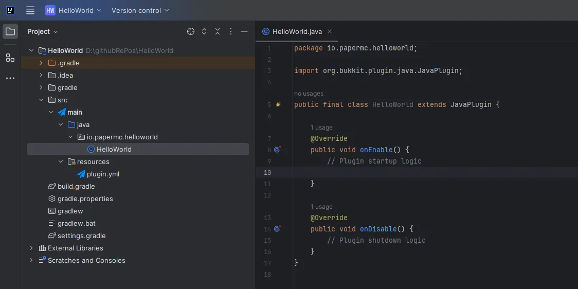 Section titled “Packages”You can see here that the ExamplePlugin class is inside the io.papermc.testplugin package.